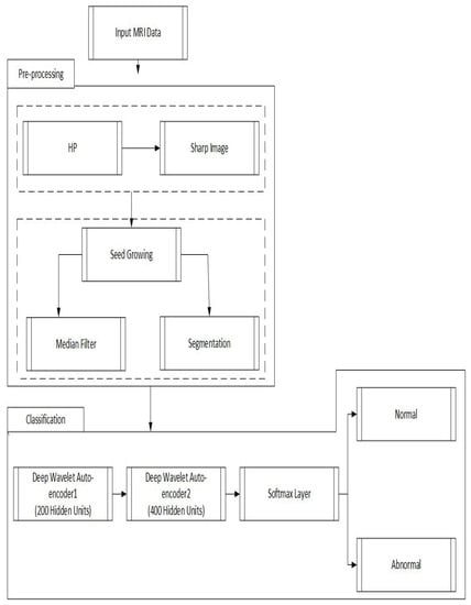The proposed model is performed in three different stages. In the first stage, a high pass filter [41] and the median filter [42] are selected to enhance input MR brain images. In the second stage, the seed growing approach [43] is utilized to segment the brain tumor. Finally, in the third stage, the segmented images are supplied to the DWAE model. Every two hidden layers are being used, which are further connected with a softmax layer for classification. Figure 2 shows the proposed approach stages.