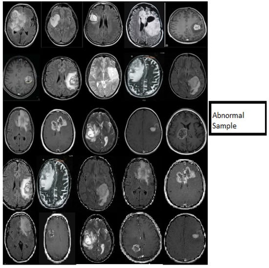 Figure 6 describes the classification stage and shows the excellent capacity of the proposed model in the classification stage using normal MR databases. The slice consists of 15 MR normal brain images processed using a classification method based on the DWAE model, and the output shows a good result. Figure 7 represents the classification stage, and notable is the perfect ability of the proposed model in the classification stage using an abnormal database. The slice consists of 15 MR abnormal brain images processed using the classification method based on the proposed model. The results show the robustness of the model to classify the brain tumor. Figure 6 and Figure 7 prove the ability of the proposed model to predict the normal MR brain images and abnormal MR brain images. Generally, the model demonstrated a high ability to process, detect, and classify brain tumors using MR images.