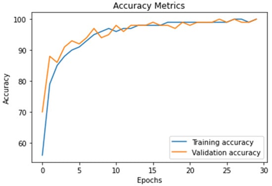 The result of the proposed model accuracy value and the model’s accurate and robust model during training and testing stages as calculated using Equation (10).