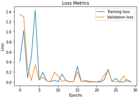 Figure 9 presents the proposed DWAE model loss value; the results show that the proposed model achieved (0.1 to 0.3) a best loss validation value during the training and testing stages. We trained and tested the proposed model using 30 epochs during the accuracy and loss validation stages.