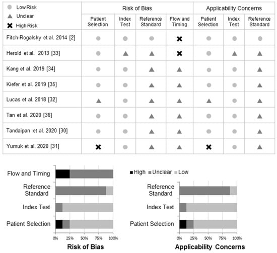 - Whiting, P.F.; Rutjes, A.W.; Westwood, M.E.; Mallett, S.; Deeks, J.J.; Reitsma, J.B.; Leeflang, M.M.; Sterne, J.A.; Bossuyt, P.M. QUADAS-2: A revised tool for the quality assessment of diagnostic accuracy studies. Ann. Intern. Med. 2011, 155, 529–536. [Google Scholar] [CrossRef]