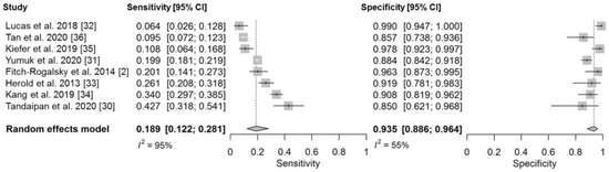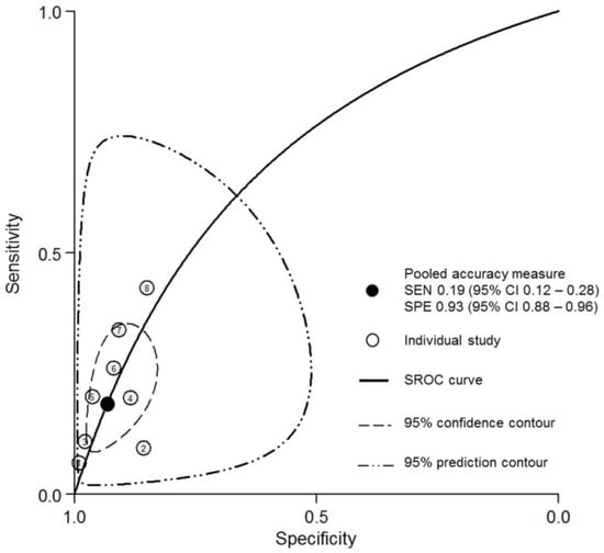 - Reitsma, J.B.; Glas, A.S.; Rutjes, A.W.; Scholten, R.J.; Bossuyt, P.M.; Zwinderman, A.H. Bivariate analysis of sensitivity and specificity produces informative summary measures in diagnostic reviews. J. Clin. Epidemiol. 2005, 58, 982–990. [Google Scholar] [CrossRef]