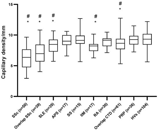 | Systemic lupus erythematosus n = 39 (RP #: n = 24; non-RP §: n = 15) | Capillary density | 7.9 (7.0;8.7) | 9.3 (8.5;10.2) | <0.001 |
