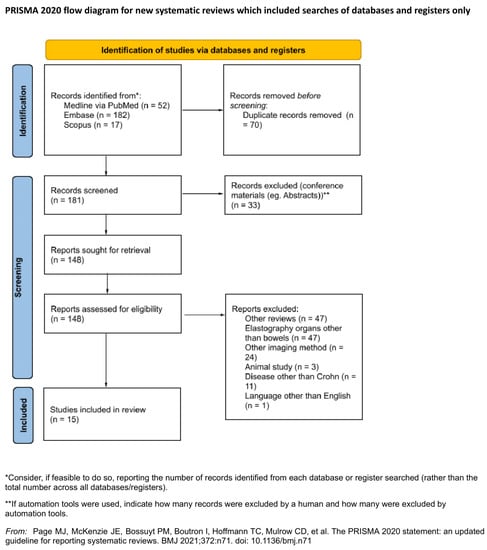 The following databases were searched in January 2021: MEDINE via PubMed, Embase and Scopus. The search was conducted utilising the following MeSH tags: ‘Ultrasound Shear Wave’, ‘Elastography’, ‘elastogram’, ‘elastographies’ AND ‘Crohn’s disease’. The authors reported the search strategy in File S2. The search was filtered using criteria that included the following: from 2010 or later, articles with abstracts, articles in English, human-based studies and original articles. Both included and excluded articles are presented in the PRISMA workflow (Figure 1).
