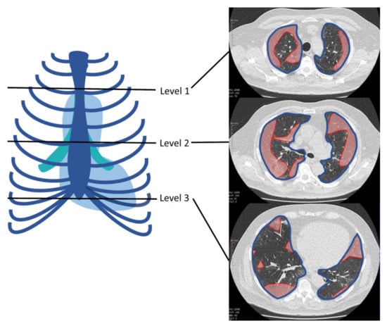 Example of region of interest (ROI)-based simple semi-quantitative (SSQ) determination of lung area involved in chest CT scans of COVID-19 patients at three predefined levels: aortic arch, tracheal bifurcation, and inferior end of xiphoid. In the axial image from each level, red indicates the area of involved lung parenchyma while the blue line outlines the total lung area at that level. Reprinted from Büttner et al. [16] with kind permission of MDPI.