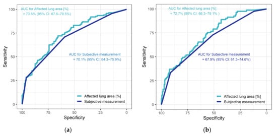 In ROC analysis of the diagnostic performance of subjective assessment of CT scans, the AUC for the endpoint need for ICU admission was 70.1% (95% CI: 64.3–75.9%) versus 67.9% (95% CI: 61.3–74.6%) for need for invasive ventilation. For total affected lung area estimated with the SSQ method, the AUC for the endpoint need for ICU admission was 73.5% (95% CI: 67.6%–79.5%). Based on Youden’s index, an involvement of 14.3% of the total lung parenchyma was found to be the optimal cutoff, resulting in 65.6% specificity and 72.1% sensitivity. For the second endpoint, the need for invasive ventilation, the AUC of the SSQ method was 72.7% (95% CI: 66.3–79.1%). The cutoff identified with Youden’s index was 8.3% (resulting in 43.2% specificity and 88.9% sensitivity) (see Figure 3).