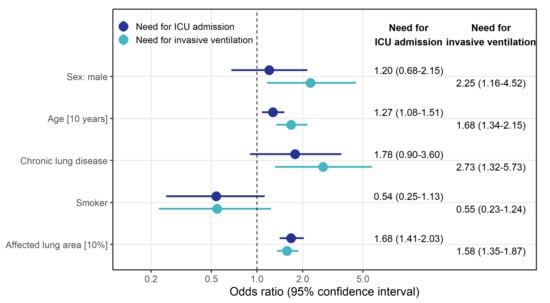 Logistic regression revealed that a 10% increase in the affected lung area estimated with the SSQ method was associated with higher odds of needing ICU treatment (OR 1.68 (95% CI: 1.41–2.03)). There was also an effect on the odds of needing invasive ventilation (OR 1.58 (95% CI: 1.35–1.87)). We found that male patients had higher odds of needing invasive ventilation (OR 2.25 (95% CI: 1.16–4.52)) or ICU treatment (OR 1.20 (95% CI: 0.68–2.15)). A pre-existing chronic lung disease also increased the odds for the need of invasive ventilation (OR 2.73 (95% CI: 1.32–5.73) or ICU treatment (OR 1.78 (95% CI: 0.90–3.60)). Smoking had a protective effect for the need of ICU admission (OR 0.54 (95% CI: 0.25–1.13) and for the need of invasive ventilation (OR 0.55 (95% CI: 0.23–1.24) (see Figure 4).