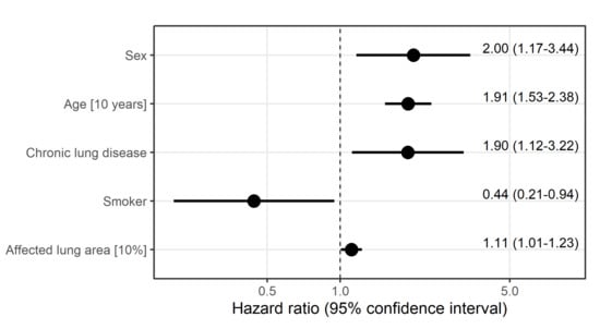 The results of the Cox regression model showed that a higher percentage of involved total lung estimated with the SSQ method increased the instantaneous risk of death with HR 1.11 (95% CI: 1.01)). We also found that pre-existing chronic lung disease (HR 1.90 (95% CI: 1.12–3.22), age (HR 1.91 (95% CI: 1.53–2.38)), and male sex (HR 2.0 (95% CI: 1.17–3.44)) each increased the instantaneous risk of death independently of other potential risk factors. Smoking had a protective effect for death (HR 0.44 (95% CI: 0.21–0.94) (see also Figure 5).