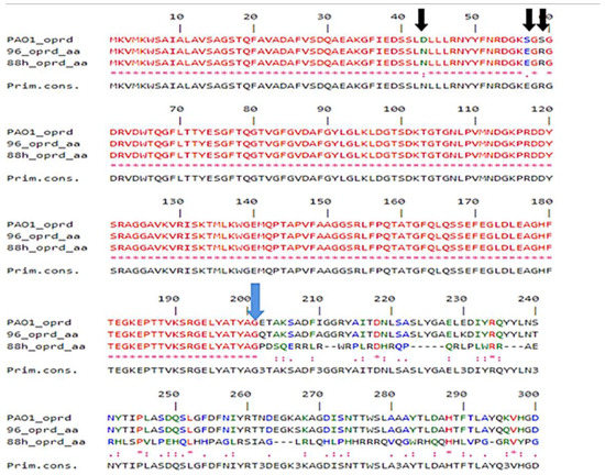 OprD gene mutations were detected in the two carbapenem-resistant P. aeruginosa isolates, 96H and 88H. The obtained OprD gene sequences were compared with the wild-type OprD gene of PAO1 isolate. Thus, the comparison of OprD protein sequences using the Network Protein Sequence Analysis NPSA-CLUSTALW (https://npsa-prabi.ibcp.fr/) revealed that chromosomal mutations were installed, conducting to the neutral base substitutions in the porin structure (D43N, S57E, and S59R), indicated by three black arrows, and a creation of a stop codon in the position 201-pb, which is designated by a blue arrow (Figure 1).