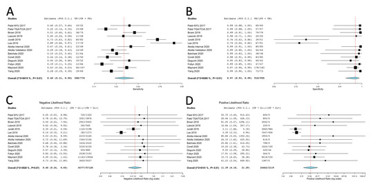 We calculated the heterogeneity of the studies using the Cochran’s Q and I2indices. The random effects model was applied when heterogeneity was I2 > 75% and/or PQ < 0.10. Otherwise, the fixed effects model was applied. Additionally, pooled sensitivity and specificity and their 95% CI were calculated. The diagnostic parameters of positive predictive value (PPV), negative predictive value (NPV), likelihood ratio for a positive test (LR+), and likelihood ratio for a negative test (LR-) were also calculated.