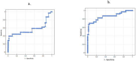 A Shapiro–Wilk test was used to check if the examined variables presented a normal distribution. The variables did not present a normal distribution, except for age in both study groups (W = 0.99157, p = 0.70221). Therefore, in the statistical analysis we have used nonparametric correlation (Spearman’s rank correlation coefficient) and relevance tests to evaluate the correlations between serum IL-6, IL-8, TNF-α levels, clinical characteristics, and selected blood count parameters. A nonparametric relevance U Mann–Whitney test was used (for independent samples) for statistical comparisons of IL-6, IL-8, TNF-α, CA125, HE4, WBC, NEU, LYM, and EOS serum levels between the group of OC and BOC patients. Differences between the groups were considered significant at p < 0.05. The critical cutoff values of IL-6, IL-8, and TNF-α were compared through a receiver operating characteristic (ROC) curve analysis.