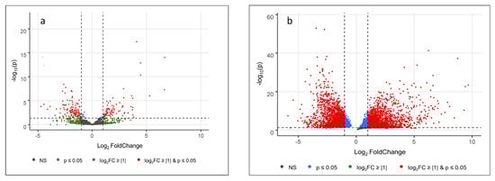 Volcano plots of miRNA (a) and mRNA (b) regulation from RNAseq. Dashed lines: significance thresholds for log2 fold change and p-value. NS: not significant; log2FC: log2 fold change.