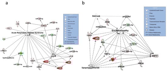 Molecular networks representing the SOFA symptom criteria 1 (“hypoxia”, left) and 2 “impaired Glasgow Coma Scale” (GCS, right). (a) The SOFA symptom criteria 1 was operationalized by the disease state acute respiratory distress syn-drome (ARDS) resulting in hypoxia. The network shows miRNAs and mRNA targets potentially involved in ARDS identified from the RNAseq and the RT-qPCR dataset. Hydrocortisone and ascorbic acid were included in the model targeting IGFB3 (insulin-like growth factor-binding protein 3). IGFB3, ACE (angiotensin-converting enzyme), and TSPO (mitochondrial permeability transition pore, also functioning a peripheral benzodiazepine receptor) were validated by RT-qPCR. (b) The molecular network for the SOFA symptom criteria 2 is visualized by the disease status septic enceph-alopathy and delirium. Let-7a-5p, miR-30c-5p, LNC2 (Lipocalin 2), MMP9 (matrix metallopeptidase 9), and TSPO were RT-qPCR validated in this network. Target transcripts of lipopolysaccharide and the sedatives propofol and midazolam, frequently used in patients with sepsis and resulting in lower GCS scores, are illustrated by arrows. Successfully validated molecules are marked with an asterisk in both networks. Solid lines connecting molecules in the networks indicate direct regulatory interactions and dashed lines indirect relationships between molecules and disease states. Downregulated and upregulated miRNAs and mRNAs are shown in green and red in both figures, respectively.