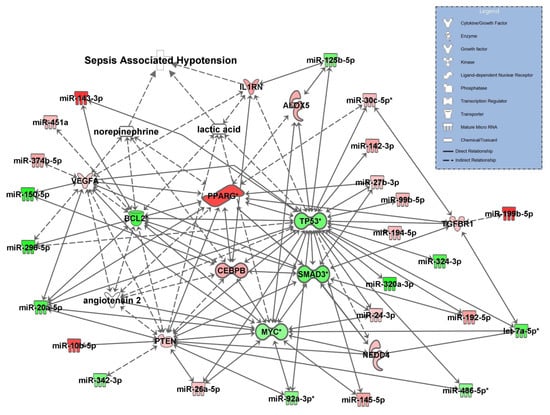 Molecular network for SOFA symptom criterion 3 “circulatory failure”, represented by the disease state sepsis associated hypotension and the network cardiovascular signaling in sepsis. let-7a-5p, miR-30c-5p, miR-486-5p, miR-92a-3p, BCL2 (BCL2 apoptosis regulator), MYC (bHLH transcription factor), PPARG (peroxisome proliferator-activated receptor gamma), SMAD3 (SMAD family member 3), and TP53 (transformation related protein 53) were RT-qPCR validated and are marked with an asterisk. Possible target molecules of the two vasopressors norepinephrine and angiotensin II are shown along with transcripts associated with increased lactate levels (s. text). Downregulated and upregulated miRNAs and mRNAs are marked green and red, respectively. Solid lines connecting molecules indicate direct regulatory interactions and dashed lines indirect relationships between molecules in the network.
