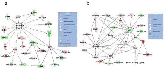 Molecular networks for the SOFA symptom criterion 4 “increase in serum creatinine” as visualized by the symptom increase in creatinine (a) and the disease state acute renal injury (b). miRNA-92a-3p, ACE (angiotensin converting enzyme), AKR1B1 (aldose reductase), SMAD3 (SMAD family member 3), LNC2 (lipocalin 2, NGAL), ANXA1 (Annexin1), MYC (bHLH transcription factor), let-7a-5p, and miR-92a-3p were validated by RT-qPCR in the networks and are marked with asterisks. Solid lines connecting molecules in the networks indicate direct regulatory interactions and dashed lines illustrate indirect relationships between molecules and creatinine (a) or disease states (b). Downregulated and upregulated miRNAs and mRNAs are marked in green and red, respectively.