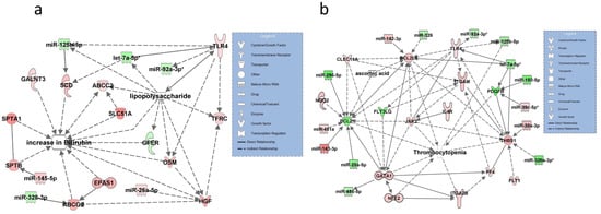 Significantly upregulated transcripts in this network were TLR4, which was activated by LPS and by the downregulated and validated miRNA let-7a-5p. Upregulated TLR4 was also shown to interact with the validated and downregulated miR-92-3p and with miR-125-5p targeting SCID. SCID was shown in the network to have a direct effect on bilirubin. Other upregulated transcripts in the network were ABCG2 and EPAS1; both had a regulatory function on bilirubin plasma levels (Figure 5a). No interactions were found for thiamin or ascorbic acid.