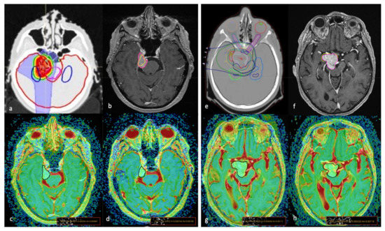 The proton therapy (PT) simulation planning computed tomography scan for target volume and organ at risk delineation (a,e); graphic representation of tumour volume variation (VV) on axial MRI T1-weighted + c images of two cases (a–h) treated with PT; areas inside the pink lines (b,f) represent the pre-treatment contour while areas inside the yellow lines represent the post-treatment (21 months) contour showing a reduction in (b) (VV = −46.9%) and mild increase in (f) (VV = +3.40%). The ROI placement on the co-registered T1w + c/ADC maps images, obtained before (c,g) and 24 months after (d,h) treatment, show lower pre-treatment values (c) in the first patient, with a significant increase after PT, while in the second patient had higher pre-treatment ADC values that did not change significantly during the follow-up exam.