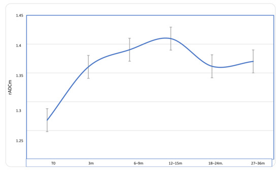The mean values of the rADCm at baseline (T0), 3, 6–9, 12–15, and 21–36 months in the overall group. A progressive and significant increase of rADCm values was detected at each time-point if compared to T0 rADCm (p < 0.05).