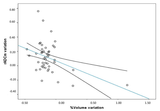 Between the variation of rADCm (Last rADC-Pre rADCm) and volume variation percentage. A significant negative correlation between the variables was found (r = −0.40; p = 0.0048; r2 = 0.21. (Trend line and mean confidence interval are shown).