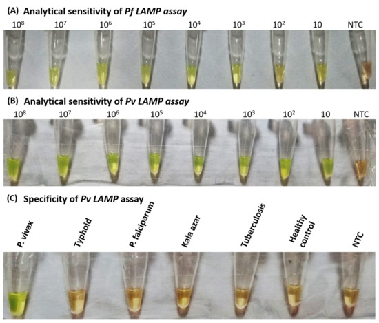 - Kaur, H.; Sehgal, R.; Bansal, D.; Sultan, A.A.; Bhalla, A.; Singhi, S.C. Development of visually improved loop mediated iso-thermal amplification for the diagnosis of Plasmodium vivax malaria in a tertiary hospital in Chandigarh, North India. Am. J. Trop. Med. Hyg. 2018, 98, 1374–1381. [Google Scholar] [CrossRef] [PubMed]