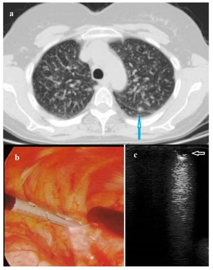 - Piolanti, M.; Coppola, F.; Papa, S.; Pilotti, V.; Mattioli, S.; Gavelli, G. Ultrasonographic localization of occult pulmonary nodules during video-assisted thoracic surgery. Eur. Radiol. 2003, 13, 2358–2364. [Google Scholar] [CrossRef]
