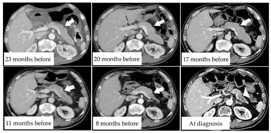 In this case–control study, we showed that FPA, which has been reported as a characteristic imaging sign of early stage PDAC [13,14,15], was observed in about one-third of the patients at least 6 months before PDAC diagnosis (Figure 3). FPA was more frequently observed in patients with PDAC than sex- and age-matched controls without PDAC. Importantly, FPA was observed in the absence of tumor masses on CT in all the 26 patients, indicating that the clinical disease stage, if determined, was presumably Stage 0 or I at that time. If FPA was recognized properly as a sign suggesting early stage PDAC, these patients might have undergone further examinations for PDAC at that time and might have been diagnosed with PDAC at relatively earlier stages. Importantly, FPA could be detected on pre-diagnostic CT in patients undergoing unenhanced CT only. This is in contrast to other imaging findings, such as MPD changes, cysts, and tumors, which usually require enhanced CT [11].