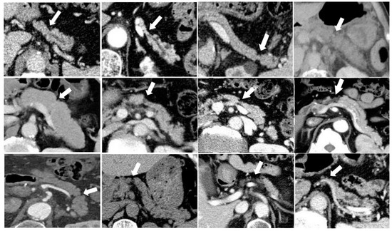- Toshima, F.; Watanabe, R.; Inoue, D.; Yoneda, N.; Yamamoto, T.; Sasahira, N.; Sasaki, T.; Matsuyama, M.; Minehiro, K.; Tateishi, U.; et al. CT Abnormalities of the Pancreas Associated with the Subsequent Diagnosis of Clinical Stage I Pancreatic Ductal Adenocarcinoma More Than One Year Later: A Case-Control Study. AJR Am. J. Roentgenol. 2021. [Google Scholar] [CrossRef]