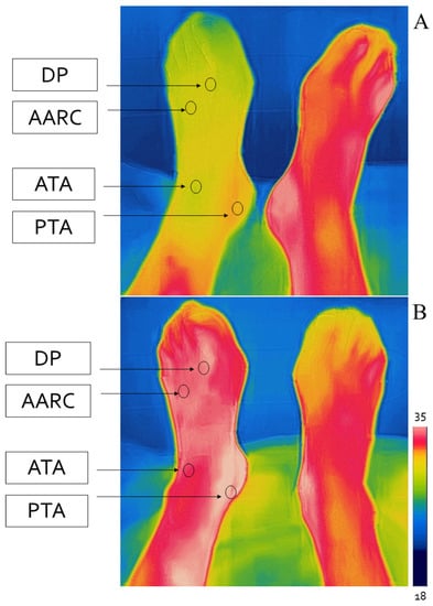 Sampling points of the foot temperature with infrared camera before (A) and after (B) revascularisation. DP: dorsalis pedis, AARC: arcuate artery, ATA: anterior tibial artery, PTA: posterior tibial artery. The scale ranges from 18 to 35 °C.