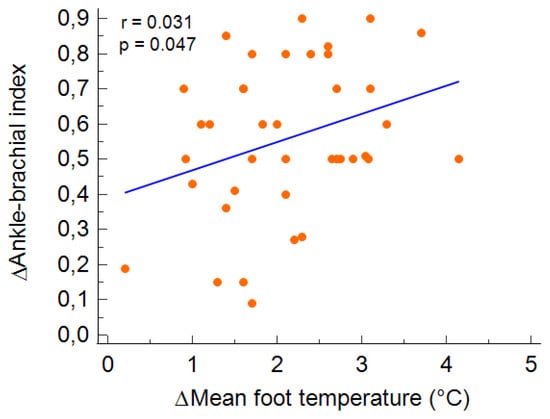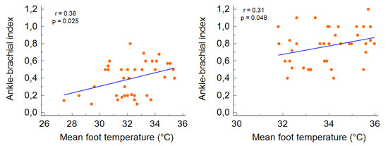 Before revascularisation, a positive significant correlation was observed for the mean temperature considering the four sampling points and the ABI value for the more impaired limb (r = 0.36; p = 0.025) and the contralateral limb (r = 0.31; p = 0.048) (Figure 2).