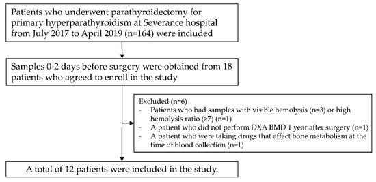 - Nakaoka, D.; Sugimoto, T.; Kobayashi, T.; Yamaguchi, T.; Kobayashi, A.; Chihara, K. Prediction of bone mass change after parathyroidectomy in patients with primary hyperparathyroidism. J. Clin. Endocrinol. Metab. 2000, 85, 1901–1907. [Google Scholar] [CrossRef] [PubMed]