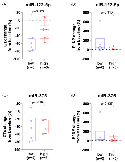 3.4. Patients with High miR-122-5p Levels Had Less CTx Change after Parathyroidectomy