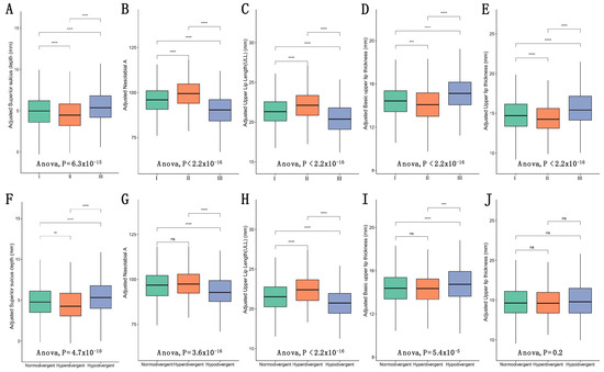 The comparison of adjusted upper lip characteristics among different sagittal (A–E) and vertical skeletal patterns (F–J). **: p < 0.01, ***: p < 0.001, ****: p < 0.0001, ns: not significant.