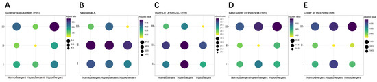 On the other hand, the differences among vertical skeletal patterns were also statistically significant for all the upper lip characteristics, except for adjusted upper lip thickness (Figure 4F–G). Both adjusted basic upper lip thickness and superior sulcus depth were significantly larger in the hypodivergent pattern (15.18 ± 1.57 mm and 5.28 ± 2.10 mm, respectively), and smaller in the hyperdivergent pattern (14.14 ± 1.62 mm and 4.34 ± 2.03 mm, respectively). Oppositely, the adjusted upper lip length and nasolabial angle were larger in the hyperdivergent pattern (22.43 ± 1.88 mm and 97.57 ± 8.45°), and smaller in the hypodivergent pattern (20.78 ± 1.95 mm and 93.05 ± 9.19°).