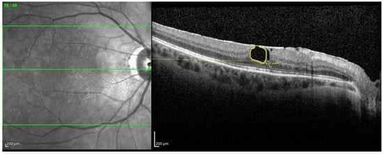 In the TL group, the median amount of tissue loss was 0.09 (0.055) mm2 with a median speed of tissue loss of 0.04 (0.02) mm2/year. ICC showed a good correlation between graders in the quantitative assessment of tissue loss (ICC = 0.863, r = 0.810). Baseline OCT B scan analysis of the total population revealed a complete PVD in 11 patients (39.28%) and an incomplete PVD in 12 patients (42.85%) with no significant difference in the two groups concerning both (p = 0.99 and p = 0.70, respectively). Four cases of lamellar hole-associated epiretinal proliferation (LHEP) were detected in the total population (14.28%). Interestingly, all of them belonged to patients from the TL group, resulting in a 28.57% prevalence of the condition. Nonetheless, this difference with the ST group did not reach statistical significance (0.098). Five out of twenty-eight patients (17.85%) presented focal foveal ellipsoid zone (EZ) disruption with no difference in prevalence in the two groups (p = 0.99).