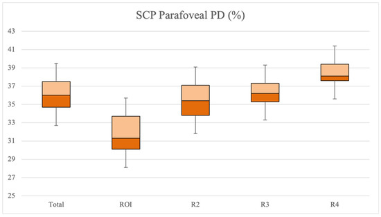 Representation of SCP parafoveal PD (%) in total parafoveal area, ROI and remaining regions in TL group. PD = perfusion density; ROI = region of interest; SCP = superficial capillary plexus; TL = tissue loss.