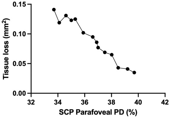 Linear correlation between SCP parafoveal PD (%) and tissue loss during the follow-up period (mm2) in TL group. PD = perfusion density; SCP = superficial capillary plexus; TL = tissue loss.