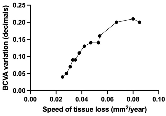 Linear correlation between speed of tissue loss (mm2/year) and BCVA variation during follow up period (decimals) in TL group. BCVA = best corrected visual acuity; TL = tissue loss.
