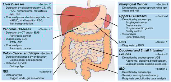 In addition to image analysis, big data analysis is suitable for AI to generalize across a variety of data types and to provide interpretation across complex variables [6]. Therefore, AI techniques have been widely applied to big data analyses, such as in genomics, novel medicine discoveries, and predictions of disease outcomes [7,8,9]. For example, IBM Watson supports oncologists by providing possible therapeutic options based on information from over 300 medical journals, over 200 academic books, and over 15,000,000 pages of literature related to 11 types of neoplasia [10,11]. In the field of gastroenterology, AI has also made remarkable progress, and many international meetings highlight AI-related sessions. In addition, several new conferences have been established over the past few decades, such as the Global GI-AI Summit [12]. Owing to the potential for image recognition and big data analysis, not only clinician, but also researchers can benefit from the application of AI methodologies. This review focuses on recent AI research in the fields of gastroenterology, hepatology, and pancreatology (summarized in Figure 1) and provides an overview of AI technology to help clinicians utilize AI in the near future.