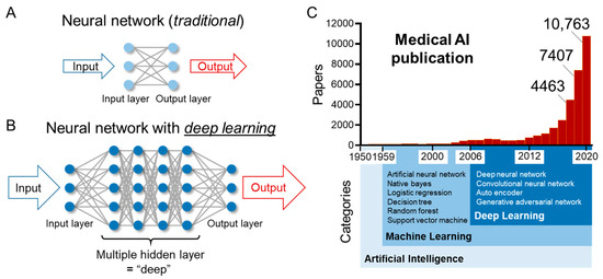 Schematics of neural networks and number of publications of medical AI. (A) A schematic of a traditional neural network algorithm. (B) A schematic of a neural network with deep learning algorithm. (C) The number of publications involving AI in the medical field. The results of a PubMed search using the following key words (“artificial intelligence” OR “machine learning” OR “deep learning” OR “neural network”) AND (medicine OR gastroenterology OR hepatology OR pancreatology OR endoscopy OR radiology OR ultrasonography OR “computed tomography” OR “clinical imaging“) are shown.