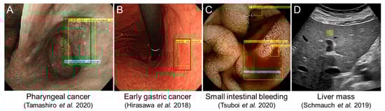 Representative images of AI-aided endoscopies and ultrasonography. (A) Pharyngeal cancer detected by AI with narrow-band imaging. Adapted from (Tamashiro A, Dig Endosc 2020) [32]. (B) Early gastric cancer detected by an AI system. Adapted from (Hirasawa T, Gastric Cancer 2018) [35]. (C) Small intestinal bleeding detected by an AI system. Adapted from (Tsuboi A, Dig Endosc 2020) [36]. (D) A liver mass detected by an AI system. Adapted from (Schmauch B, Diagn Interv Imaging 2019) [37].