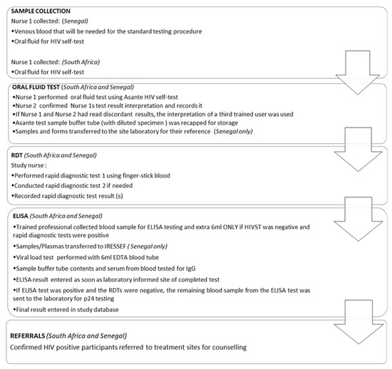 A 5 mL blood sample was drawn for laboratory gold standard HIV-1 ELISA testing, which was performed on the Abbott Architect 1000SR HIV Ag/Ab combination (Abbott, Green Oaks, IL, USA). Figure 3 further clarifies the procedure that was followed in each country.