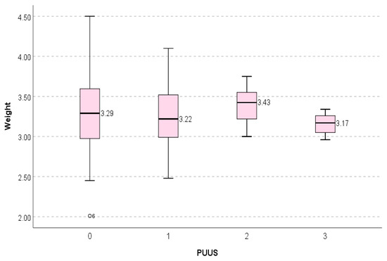 The PUUS grade did not vary significantly with the birth weight. Weight was constant when PUUS = 4; therefore, it was omitted from the statistical analysis.
