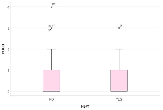 PUUS grade did not vary significantly with the presence (YES) or absence (NO) of high blood pressure of the parturient; HBP1, high blood pressure.