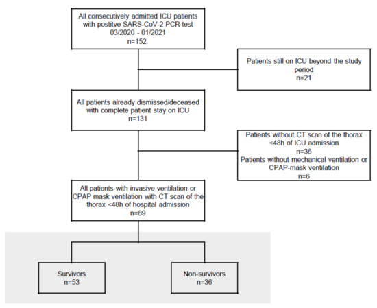 This retrospective single-center study was approved by the local institutional review board and included all COVID-19 patients (n = 89) requiring mechanical ventilation or non-invasive ventilation with continuous positive airway pressure (CPAP-mask), admitted to the participating ICUs from 03/2020 until 01/2021 and already discharged or deceased by end of January 2021, with positive SARS-CoV-2 PCR testing and CT scans within 48 h of hospital admission, as shown in the study flow chart (Figure 1).