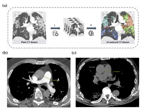 (a). CT scans of the thorax assessed with artificial intelligence: lung injury was quantified using a severity score ranging from 0 to 25. Left: Plain coronal slice image of the thorax CT scan in a patient with SARS-CoV-2 positive PCR test. Right: AI analyzed CT dataset with color staining of affected lung tissue (colored areas in each lung lobe). I. Pre-processing with data anonymization and uploading. II. AI-based analysis of CT dataset. (b,c). Measurements of the diameter of the ascending aorta (AA) and the pulmonary trunk (PA) close to the bifurcation in enhanced (b) and unenhanced (c) CT images for the calculation of the PA-to-AA ratio.