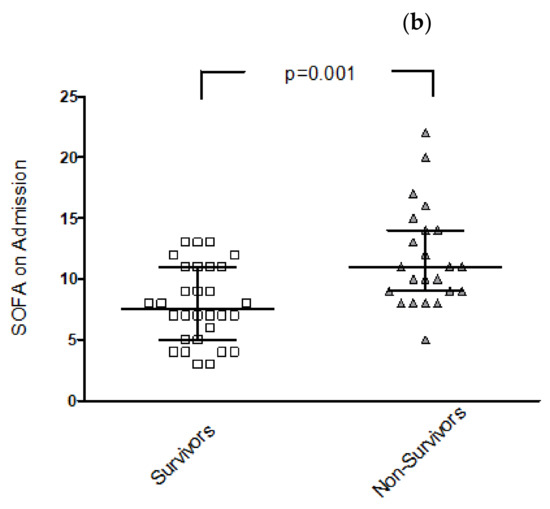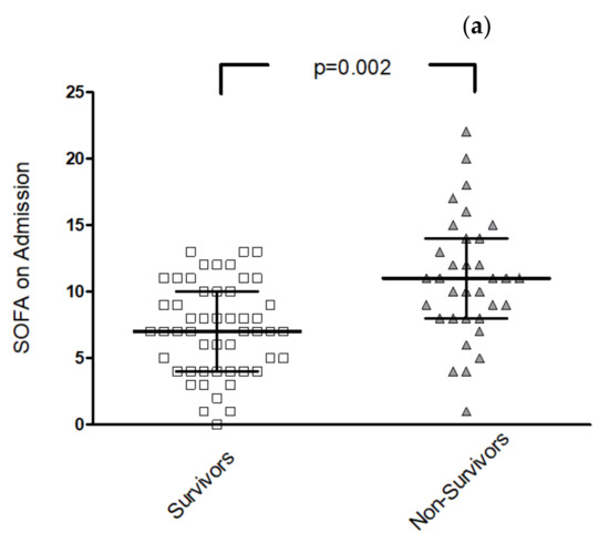 The SOFA score on admission showed significant differences between survivors and non-survivors (7, IQR 4–10 vs. 11, IQR 8–14, p < 0.001), as shown in Figure 3a. The CT severity score on admission and the PA-to-AA ratio were not significantly different between the groups, and the oxygenation index on admission was not significantly different between the groups either. Lung compliance on admission was significantly lower in the non-survivor group, p = 0.011. All results are shown in Supplemental Table S1.