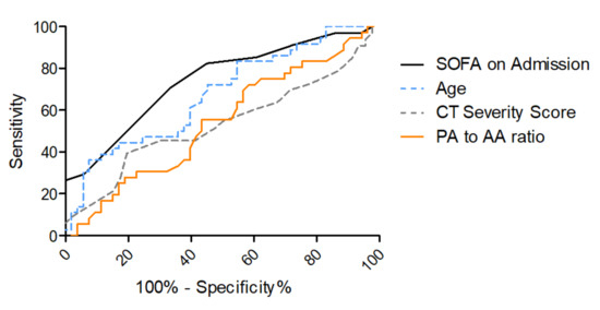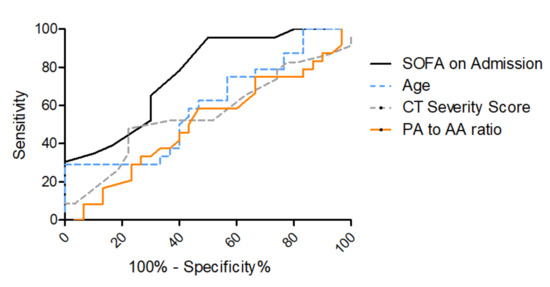 Additionally, ROC analysis for mortality prediction was performed in the subgroup of patients with moderate or severe ARDS on admission (oxygenation index <200) to evaluate if quantification of lung injury on chest CT has a higher predictive potential in patients with a lung-predominant disease manifestation. In those cases, the SOFA score on admission yielded an AUC of 0.77 (95%-CI 0.64–0.89), whereas age only yielded an AUC of 0.60 (95%-CI 0.44–0.75), as shown in Figure 5 and Table 4. Also in this subgroup, the CT severity score on admission and the PA-to-AA ratio did not yield sufficient AUCs for mortality prediction (0.55 (95%-CI 0.39–0.72) and (0.51 (95%-CI 0.35–0.67), respectively).