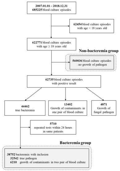 From 1 January 2007–31 December 2018, a total of 685,225 blood culture test data were extracted from Sinchon and Gangnam Severance Hospitals, Yonsei University-affiliated tertiary-care centers in Seoul, Republic of Korea. During a 12-year period, 521,948 cases from Sinchon Severance Hospital and 163,277 cases from Gangnam Severance Hospital were extracted. All inpatients who underwent blood culture tests, regardless of their admitted location (emergency room, general ward, or intensive care unit), were included in this study. Of these, 62,454 cases in patients younger than 18 years old were excluded from the study, and 560,036 cases with no blood culture growth were included as a control group with non-bacteremia. Only confirmed true bacteremia data were included in bacteremia group; those considered to be contamination of normal skin flora (13,402 cases) and fungal infection (4871 cases) were also excluded from the bacteremia group. The 5710 cases of duplicated blood culture tests within 24 h in the same patient were not included in the bacteremia group. Finally, 38,752 true bacteremia episodes were identified from 622,771 blood culture episodes, and 560,036 non-bacteremia episodes were used as controls (Figure 1).