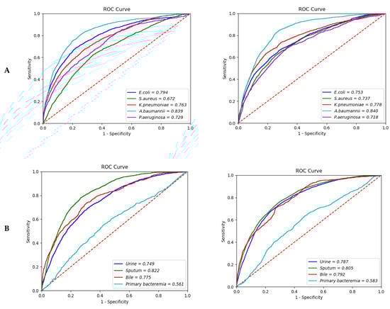 Compared to primary bacteremia, the expected performance of bacteremia with the same strain reported in sputum (i.e., bacteremia caused by pneumonia) showed the highest AUROC: 0.822 (95% CI; 0.8217–0.8299) in the 12-h model and 0.805 (95% CI; 0.8041–0.8052) in the 24-h model. For biliary infection, an AUROC of 0.775 (95% CI; 0.7742–0.7764) was observed in the 12-h model and 0.792 (95% CI; 0.7910–0.7936) in the 24-h model. In contrast, the prediction for primary bacteremia showed an AUROC of 0.561 (95% CI; 0.5572–0.5651) in the 12-h model and 0.583 (95% CI; 0.5823–0.5855) in the 24-h model (Figure 2B).
