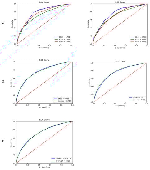 In the analysis of the three stratified age groups—young (18–39), middle (40–59), and older (60–80 years)—the number of participants in each group increased as age increased. However, the prediction performance showed the opposite tendency: the AUROC was 0.781 (95% CI; 0.7780–0.7868) in the younger age group and 0.761 (95% CI; 0.7594–0.7622) in the older age group in the 12-h model. In the 24-h model, the AUROC decreased slightly, at 0.758 (95% CI; 0.7554–0.7648) and 0.723 (95% CI; 0.7221–0.7238) in the younger and older age groups, respectively (Figure 2C). Furthermore, there were no significant differences in the prediction performance by gender (AUROC, 0.763 (95% CI; 0.7630–0.7636) vs. 0.759 (95% CI; 0.7586–0.7600) in the 12-h model; 0.748 (95% CI; 0.7473–0.7481) vs. 0.760 (95% CI; 0.7597–0.7608) in the 24-h model) (Figure 2D). The overall comparison between extraction time of data showed similar AUROC with 0.726 (Figure 2E).